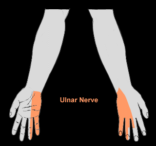 The ulnar n. is formed from spinal roots C8 and T1. It innervates the following muscles: Flexor carpi ulnaris, Flexor digitorum profundus, Palmaris brevis, Adductor pollicis, Flexor pollicis longus, Interossei, Abductor digiti minimi, Opponens digiti minimi, Flexor digiti minimi, Lumbricales 3 & 4, and the Interossei.